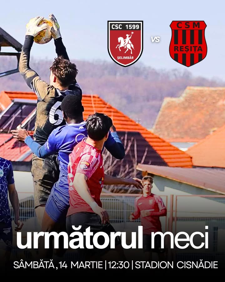 Toată lumea prezentă la stadion ! 🔴⚪ 📍 CSC 1599 Șelimbăr vs. CSM Reșița 📅 Sâmbătă, 14 martie ⏰ Ora 12:30 🏟️ Stadion Cisnădie @urmăritori — Sursă: Preluat de pe pagina oficială de Facebook CSC 1599 Selimbar https://www.facebook.com/reel/2430052437457358/